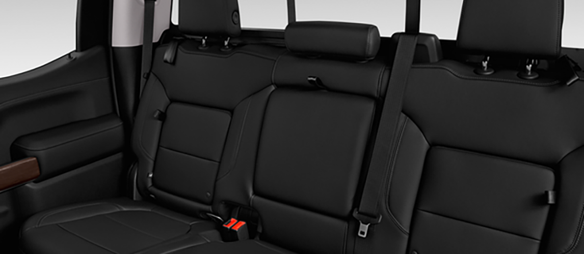 On the more affordable end of the Sierra range, cloth seats are standard. The base trim is equipped by default with Jet Black vinyl but has optional no-cost access to cloth upholstery, too, while SLE and Elevation trim add Slate and Dark Walnut upholstery options and forgo the vinyl. These colors are also available on the SLT, but the cloth is upgraded to perforated leather. The top-spec Denali gets premium leather in Jet Black or a mix of Dark Walnut and Dark Ash Grey. AT4 trim comes with its model-specific Jet Black perforated leather with Kalahari inserts. As far as trim goes, there's nothing that stands out. Even high-end models get faux metal trim on the center console and steering wheel.