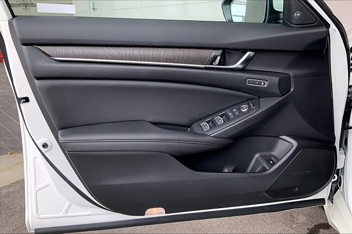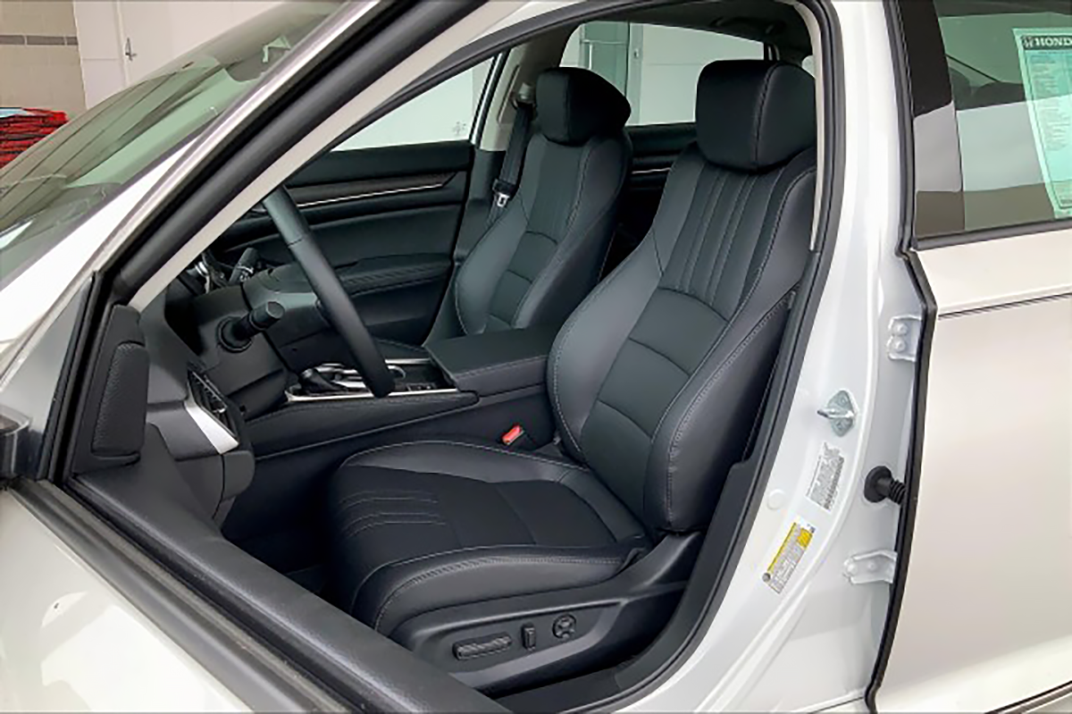 Depending on the exterior color, the entry-level Accord LX's interior can be had in a choice of Black or Ivory, with cloth-upholstered seats and silver inserts on the dashboard and door panels. However, your choice of exterior color or trim will dictate whether the Ivory interior is offered or not. The Sport also has cloth-trimmed seats but the interior inserts are in black. Further up in the lineup, the Accord gains a leather-wrapped steering wheel and shift knob. Leather-trimmed seats are equipped to upper trims (perforated on the Touring), but the same Black/Ivory color choices apply here, while wood-effect trim inlays are fitted to more luxurious models. Sport and Sport Special Edition derivatives have unique sport pedals. All 1.5-liter models besides the LX come with a leather-wrapped gear shift knob.